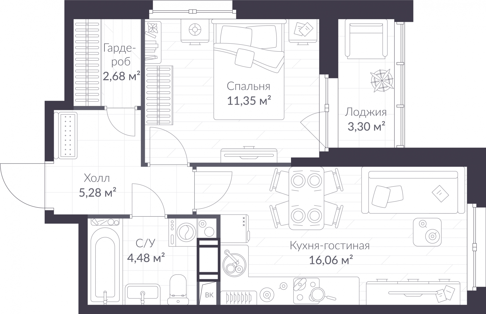 - Жилая площадь 11.35 м²