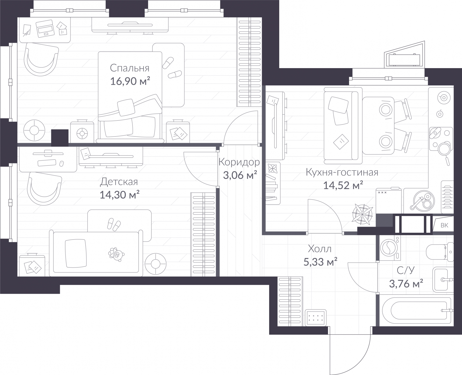 - Общая площадь 57.87 м²