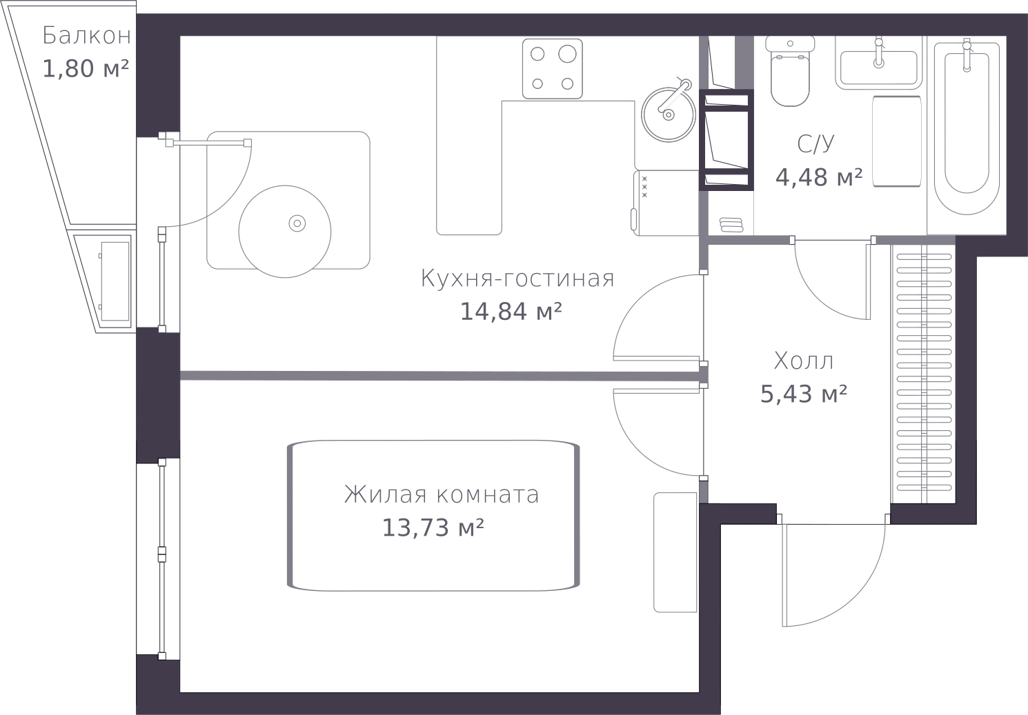 - Жилая площадь 13.73 м²