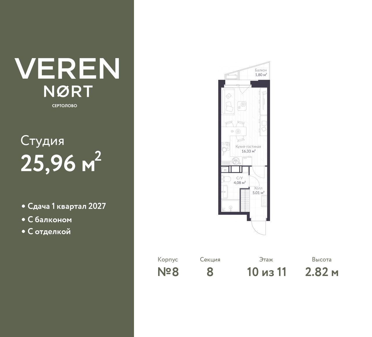 Торопитесь оформить бронирование, пока действует скидка! Предложение ограничено! Стоимость квартиры указана со скидкой, ваша экономия составит 575,653 RUB. Звоните, мы вам все подробно расскажем! Однокомнатная квартира-студия от застройщика с предчистовой отделкой в Veren Nort Сертолово на 10 этаже. Общая площадь: 25.96 кв.м., площадь гостиной 16.33 кв.м., из которых 5 кв.м. выделено под кухонную зону. Все окна выходят на одну сторону. В квартире один балкон, один совмещенный санузел. Высота потолков 2.82 м. Квартира находится в корпусе 8. Дом монолитный, одноподъездный, высотой 11 этажей. На этаже 14 квартир. В подъезде 1 пассажирский и 1 грузовой лифт. Окончание строительства - 4 квартал 2026 года. Оформление сделки по договору долевого участия. С балконом, с отделкой, вид на приватный двор. Сочетание современной архитектуры и отличной экологии севера Лен. области. Выразительный облик домов разработан именитым архитектурным бюро «Остоженка». Характеристики жилого комплекса исключительны: продуманный ландшафтный дизайн, оригинальные парадные, разработанные по индивидуальному дизайн-проекту, современные детские и многофункциональные спортивные площадки, летний кинотеатр под открытым небом, два детских сада. Комплекс создается в уже сложившейся инфраструктуре г. Сертолово и обладает удобным транспортным сообщением с Санкт-Петербургом. В 300 метрах от «VEREN NORT сертолово» планируется транспортно-пересадочный узел «Сертолово», который обеспечит удобную железнодорожную связь с Финляндским вокзалом Санкт-Петербурга. (AQID02417920)