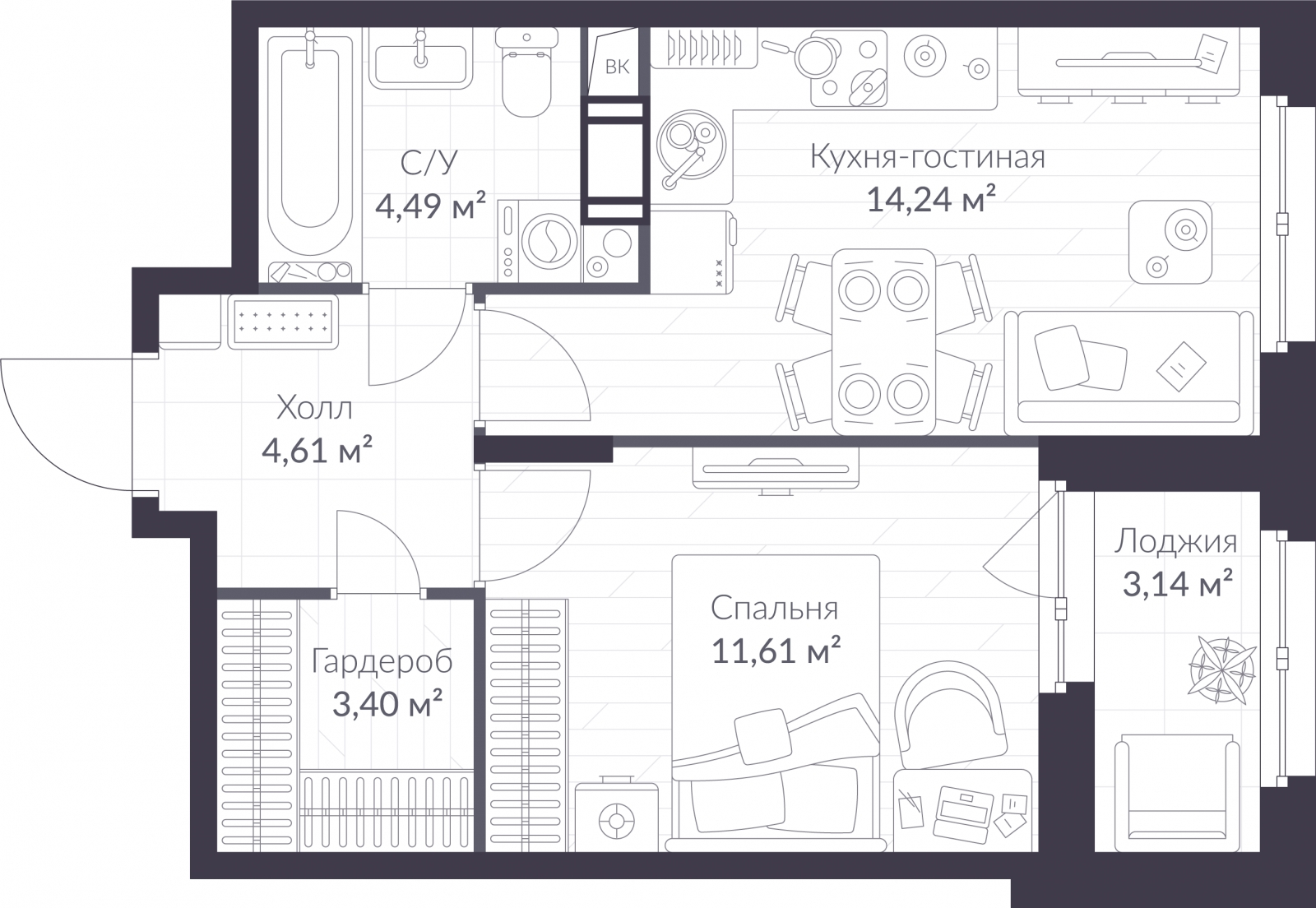 - Площадь кухни 14.24 м²