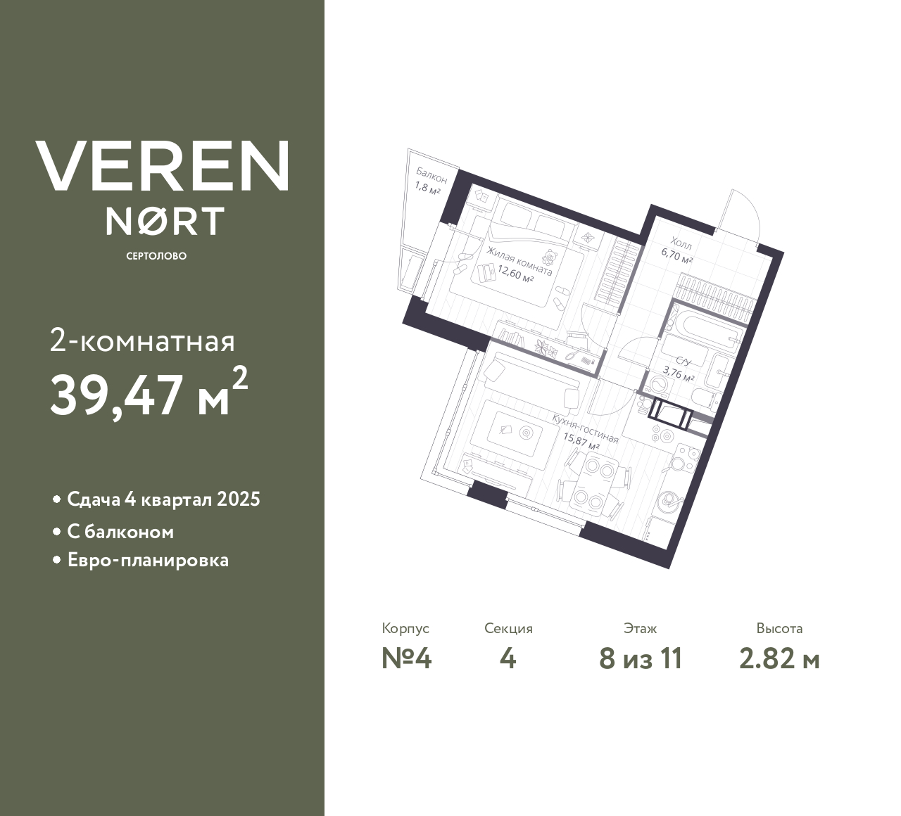 Спешите оформить бронирование по этой цене! Предложение ограничено! Стоимость квартиры указана со скидкой, ваша экономия составит 1,787,477 RUB. Звоните, наши менеджеры вам все расскажут! Однокомнатная квартира в Veren Nort Сертолово на 8 этаже. Квартира без отделки, после оформления собственности можно делать ремонт. Общая площадь: 39.47 кв.м., жилая: 12.6 кв.м., площадь просторной куxни-гостиной: 15.87 кв.м. Квартира угловая, идеально подойдет любителям тишины и панорамных видов. В квартире один балкон, один совмещенный санузел. Высота потолков 2.82 м. Квартира находится в корпусе 4. Дом монолитный, одноподъездный, высотой 11 этажей. На этаже 14 квартир. В подъезде 1 пассажирский и 1 грузовой лифт. Начало строительства - 3 квартал 2023 года. Окончание строительства - 4 квартал 2025 года. Оформление сделки по договору долевого участия. С балконом, евро-планировка, вид на приватный двор. Сочетание современной архитектуры и отличной экологии севера Лен. области. Выразительный облик домов разработан именитым архитектурным бюро «Остоженка». Характеристики жилого комплекса исключительны: продуманный ландшафтный дизайн, оригинальные парадные, разработанные по индивидуальному дизайн-проекту, современные детские и многофункциональные спортивные площадки, летний кинотеатр под открытым небом, два детских сада. Комплекс создается в уже сложившейся инфраструктуре г. Сертолово и обладает удобным транспортным сообщением с Санкт-Петербургом. В 300 метрах от «VEREN NORT сертолово» планируется транспортно-пересадочный узел «Сертолово», который обеспечит удобную железнодорожную связь с Финляндским вокзалом Санкт-Петербурга. (AQID02411685)