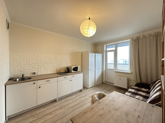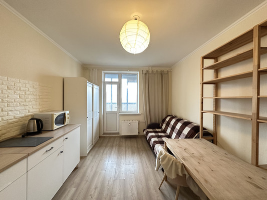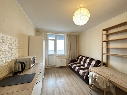 -Общая площадь 20.1 м.кв. без учёта застеклённого балкона (вместе с балконом 23,6 м. кв.)-Совмещённый и полностью оборудованный санузел с душевой кабиной и настенной плиткой от пола до потолка.-Хороший вид из окон на улицу Шувалова.-Квартира светлая, тёплая, чистая, можно заехать и комфортно жить. Полы - качественный ламинат.-Высокий 14 этаж, улицу практически не слышно.-Есть всё необходимое для комфортной жизни: кухонный гарнитур с мойкой, стиральная машина, холодильник, СВЧ-печь, шкафы, диван, стол. -Вся мебель и техника в квартире при желании будет в подарок.-Спокойные соседи и комфортная среда.