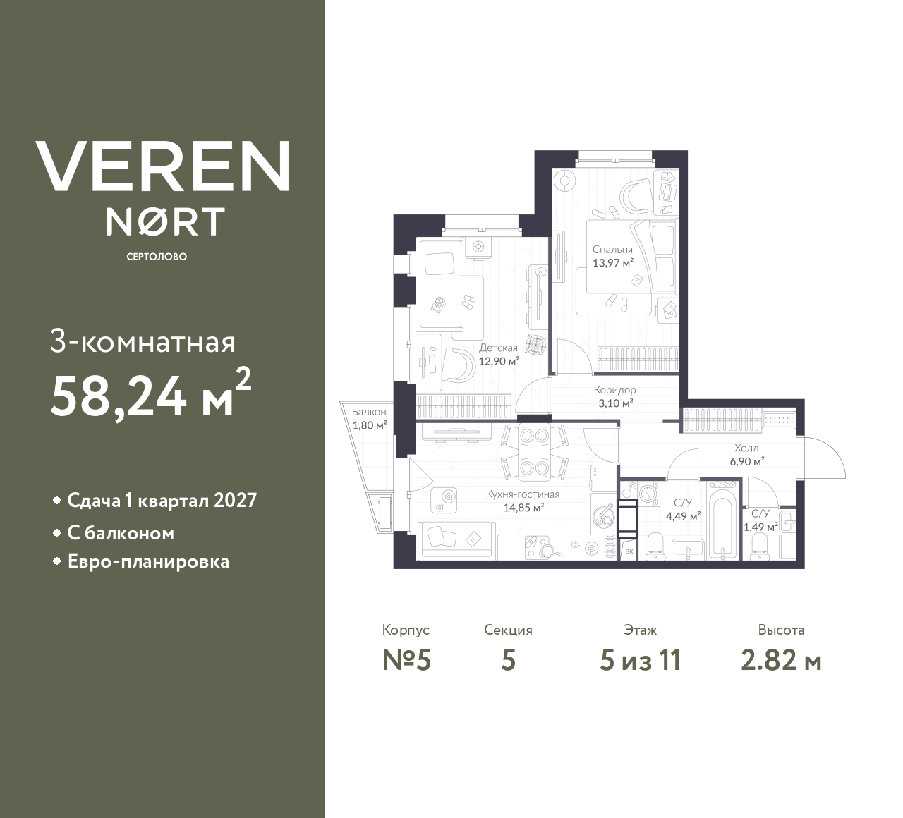 Спешите забронировать по этой цене! Предложение ограничено! Стоимость квартиры указана со скидкой, ваша экономия составит 1,044,145 RUB. По всем вопросам обращайтесь в офис продаж, мы вам все подробно расскажем! Просторная 2-комн. квартира в Veren Nort Сертолово на 5 этаже. Квартира без отделки, новый владелец может сделать ремонт по своему дизайн-проекту. Общая площадь: 58.24 кв.м., жилая: 26.66 кв.м., площадь просторной куxни-гостиной: 14.99 кв.м. Угловая квартира, идеально подойдет любителям тишины и панорамных видов. В квартире один совмещенный и один раздельный санузел. Высота потолков 2.82 м. Квартира находится в корпусе 5. Дом монолитный, одноподъездный, высотой 11 этажей. На этаже 14 квартир. В подъезде 1 пассажирский и 1 грузовой лифт. Окончание строительства - 1 квартал 2027 года. Оформление сделки по договору долевого участия. С балконом, евро-планировка, вид на приватный двор. Сочетание современной архитектуры и отличной экологии севера Лен. области. Выразительный облик домов разработан именитым архитектурным бюро «Остоженка». Характеристики жилого комплекса исключительны: продуманный ландшафтный дизайн, оригинальные парадные, разработанные по индивидуальному дизайн-проекту, современные детские и многофункциональные спортивные площадки, летний кинотеатр под открытым небом, два детских сада. Комплекс создается в уже сложившейся инфраструктуре г. Сертолово и обладает удобным транспортным сообщением с Санкт-Петербургом. В 300 метрах от «VEREN NORT сертолово» планируется транспортно-пересадочный узел «Сертолово», который обеспечит удобную железнодорожную связь с Финляндским вокзалом Санкт-Петербурга. (AQID02418384)