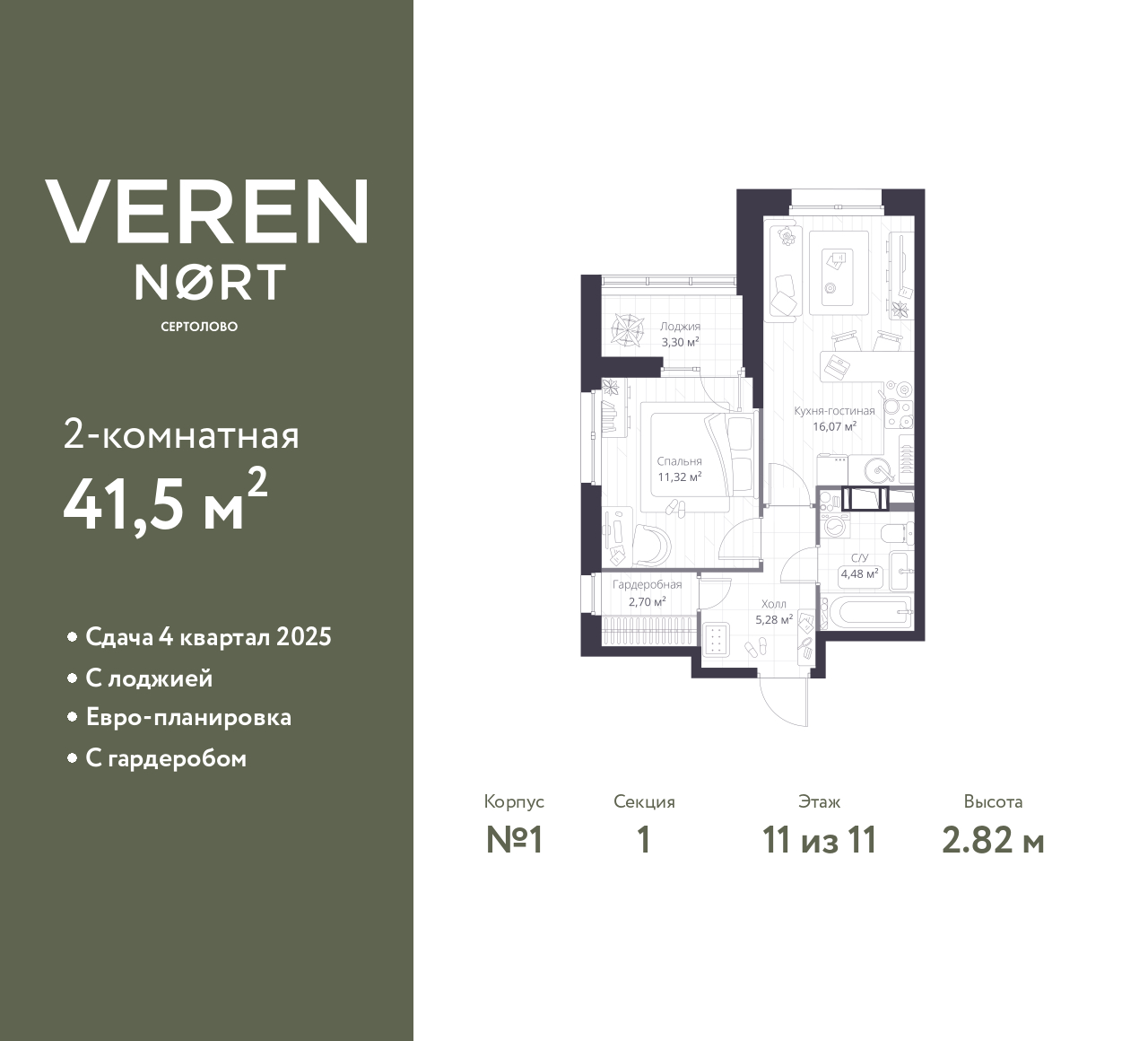 Торопитесь оформить бронирование, пока действует скидка! Срок акции ограничен! Стоимость квартиры указана со скидкой, ваша экономия составит 2,609,336 RUB. По всем вопросам звоните в офис продаж, наши менеджеры вам все расскажут! Просторная 1-комн. квартира в Veren Nort Сертолово на 11 этаже. Квартира без отделки, полностью готова к ремонту. Общая площадь: 41.5 кв.м., жилая: 11.32 кв.м., площадь просторной куxни-гостиной: 15.9 кв.м. Квартира угловая, идеально подойдет любителям тишины и панорамных видов. В квартире одна лоджия, один совмещенный санузел. Высота потолков 2.82 м. Квартира находится в корпусе 1. Дом монолитный, одноподъездный, высотой 11 этажей. На этаже 14 квартир. В подъезде 2 грузовых лифта. Начало строительства - 3 квартал 2023 года. Окончание строительства - 4 квартал 2025 года. Оформление сделки по договору долевого участия. С лоджией, евро-планировка, с гардеробом, вид на приватный двор. Сочетание современной архитектуры и отличной экологии севера Лен. области. Выразительный облик домов разработан именитым архитектурным бюро «Остоженка». Характеристики жилого комплекса исключительны: продуманный ландшафтный дизайн, оригинальные парадные, разработанные по индивидуальному дизайн-проекту, современные детские и многофункциональные спортивные площадки, летний кинотеатр под открытым небом, два детских сада. Комплекс создается в уже сложившейся инфраструктуре г. Сертолово и обладает удобным транспортным сообщением с Санкт-Петербургом. В 300 метрах от «VEREN NORT сертолово» планируется транспортно-пересадочный узел «Сертолово», который обеспечит удобную железнодорожную связь с Финляндским вокзалом Санкт-Петербурга. (AQID02500078)