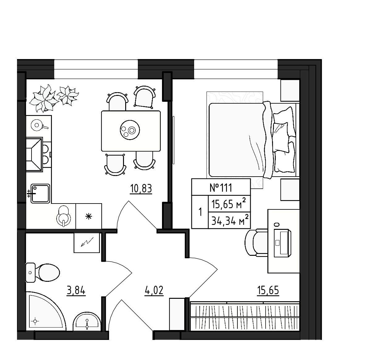 - Общая площадь 34.34 м²