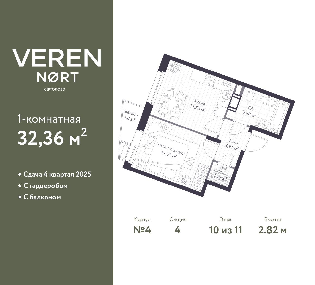 Успейте оформить бронирование по акционной цене! Предложение ограничено! Стоимость квартиры указана со скидкой, ваша экономия составит 1,439,731 RUB. Информация по телефону, наши менеджеры вам все расскажут! 1-комн. квартира в Veren Nort Сертолово на 10 этаже. Квартира без отделки, полностью готова к чистовой отделке и дальнейшему ремонту. Общая площадь: 32.36 кв.м., жилая: 11.37 кв.м., площадь просторной куxни-гостиной: 11.53 кв.м. Все окна выходят на одну сторону. В квартире один балкон, один совмещенный санузел. Высота потолков 2.82 м. Квартира находится в корпусе 4. Дом монолитный, одноподъездный, высотой 11 этажей. На этаже 14 квартир. В подъезде 1 пассажирский и 1 грузовой лифт. Начало строительства - 3 квартал 2023 года. Окончание строительства - 4 квартал 2025 года. Оформление сделки по договору долевого участия. С балконом, с гардеробом, вид на приватный двор. Сочетание современной архитектуры и отличной экологии севера Лен. области. Выразительный облик домов разработан именитым архитектурным бюро «Остоженка». Характеристики жилого комплекса исключительны: продуманный ландшафтный дизайн, оригинальные парадные, разработанные по индивидуальному дизайн-проекту, современные детские и многофункциональные спортивные площадки, летний кинотеатр под открытым небом, два детских сада. Комплекс создается в уже сложившейся инфраструктуре г. Сертолово и обладает удобным транспортным сообщением с Санкт-Петербургом. В 300 метрах от «VEREN NORT сертолово» планируется транспортно-пересадочный узел «Сертолово», который обеспечит удобную железнодорожную связь с Финляндским вокзалом Санкт-Петербурга. (AQID02313463)