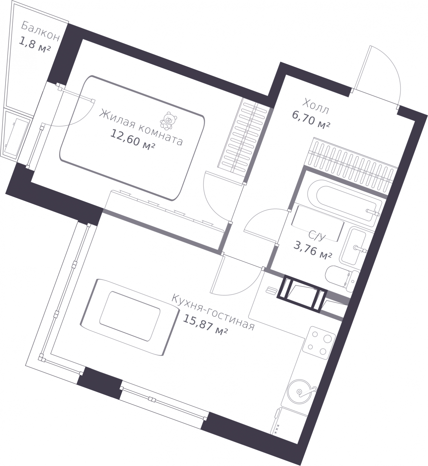 - Жилая площадь 12.6 м²