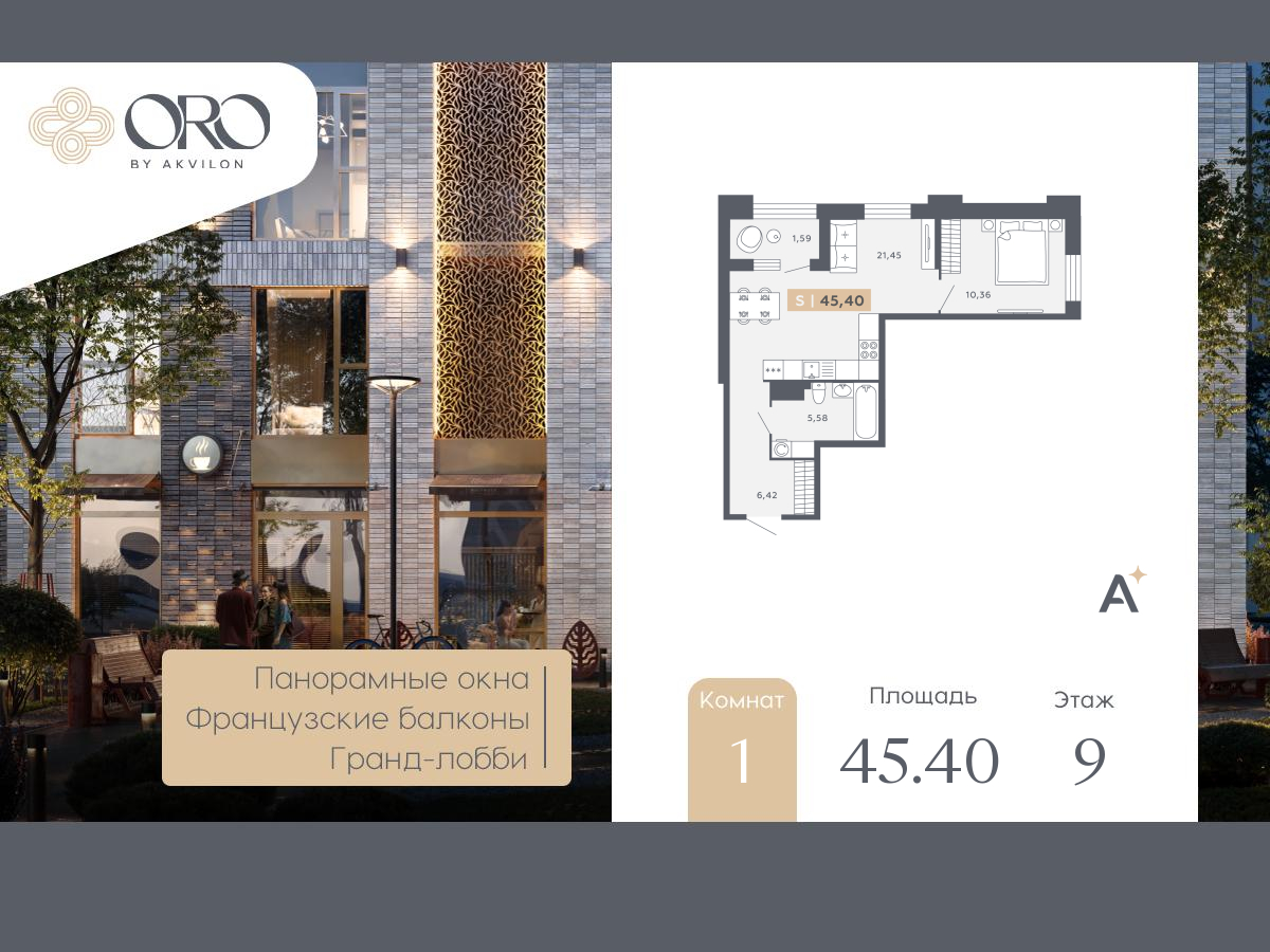 1-комн. квартира с отделкой в ЖК "ORO by Akvilon" на 9 этаже. Общая площадь: 45.4 кв.м., жилая: 10.36 кв.м., площадь просторной кухни-столовой: 21.45 кв.м. Квартира угловая, очень светлая, естественная вентиляция при открытии окон. В квартире одна лоджия, один совмещенный санузел. Высота потолков 2.85 м. Квартира находится в корпусе 1. Дом монолитный, одноподъездный, высотой 17 этажей. На этаже 12 квартир. В подъезде 1 пассажирский и 1 грузовой лифт. Окончание строительства - 4 квартал 2027 года. Оформление сделки по договору долевого участия. В шаговой доступности от дома находится станция метро (расстояние по прямой) «Звёздная» (800 м), также недалеко от этого корпуса находятся станции метро: «Купчино», «Московская», «Ленинский Проспект», «Дунайская». ЖК «ORO by Akvilon» - старт продаж жилого комплекса бизнес-класса в Московском районе. -Панорамные окна в пол во всех квартирах -Алюминиевые оконные профили с многокамерными стеклопакетами -Французские балконы с золотой окантовкой -Высота этажа – 3,15 метра -Увеличенные дверные проемы - 2,3 метров высотой -Выделенные места для кондиционеров на каждом этаже -Фреоновые трубки заведенные в квартиру от мест установки внешних блоков кондиционеров -Дизайнерская отделка гранд-лобби с биокамином и золотыми элементами -Импортные бесшумные лифты с дизайнерской отделкой и увеличенной высотой кабины Отделка квартир Премиальная отделка в двух цветовых решениях: Beigestone и Greystone. Дозаказ для любой квартиры Стандарты Группы Аквилон для вашей комфортной жизни Thermo-S – экономия на коммунальных платежах за счет дополнительно утепленных стен, кровли и цоколя. Энергоэффективные окна с селективным покрытием и аргоновым заполнением Soundstop - дополнительная шумоизоляция внутренних перегородок и межэтажных перекрытий, шумозащитные окна, малошумные лифты Light-in - в квартирах комфортный микроклимат. Многокамерные стеклопакеты сохраняют тепло зимой и отсеивают излишки излучения солнечного света летом, сохраняя прохладу в помещении. Vent-in - в каждой комнате есть клапаны индивидуальной вентиляции, которые обеспечивают приток свежего воздуха с улицы. inHOME – умный дом в каждой квартире Интеллектуальная цифровая система, которая позволит дистанционно решать бытовые вопросы, управлять квартирой и экономить на оплате коммунальных услуг. В состав inHOME входят: IP-домофон, Face key, «умные» счетчики, датчики протечки, дистанционное отключение розеток, и т.д. Подземный паркинг -Лифты в каждой секции со спуском в паркинг -Отделка лифтовых холлов паркинга в стиле Гранд лобби + дизайнерская навигация самого паркинга -Возможность установки электрозарядки в паркинге или на территории ЖК -GSM усилитель в паркинге Двор -Ландшафтный дизайн с геопластикой и цветочными аркадами -Сад цветущих сезонов -Разноуровневая подсветка -Детские площадки нового поколения -Живой “зелёный забор” -Закрытый двор без машин Локация -7 мин. до м. Звездная -10 мин. до м. Московская -15 мин. до аэропорта Пулково -30 мин. до Невского пр. (AQID02527949)