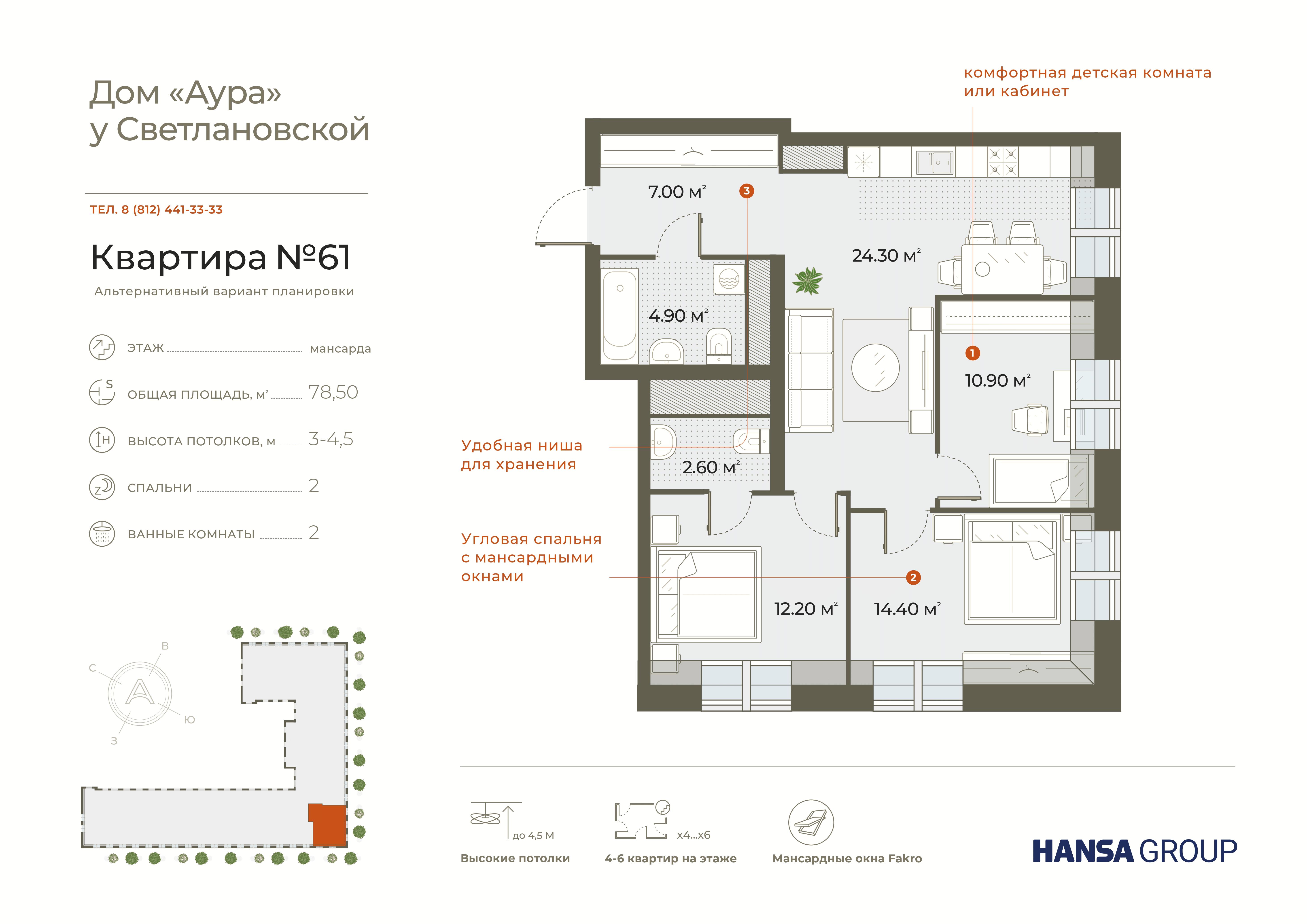 «Аура» — это малоэтажный дом середины XX в. с неоклассической архитектурой — рустованным фасадом, арочными окнами и французскими балконами. Застройщик Hansa Group сохранил аутентичный внешний вид и наполнил здание современными инженерными и планировочными решениями. На расстоянии 5-ти минут от дома расположены 2 крупных парка – Сосновка и Удельный парк. Инфраструктура квартала включает все самое необходимое: медицинские клиники, детские сады и школы, торговые центры, рестораны. Рядом с домом работает частная школа «Паскаль Лицей», Естественно-научный лицей, Физико-техническая школа имени Ж. И. Алферова, Политехнический университет. Внутренняя территория полностью закрыта от машин и посторонних. Доступ во внутренние дворы — только по электронному ключу. При входе в каждую парадную установлены видеодомофоны. По периметру территории, у детских площадок, в холлах, межквартирных коридорах и лифтах предусмотрена система видеонаблюдения. Запись с камер транслируется в пункт охраны. Квартира на мансардном этаже 78,5 м2 передается с предчистовой отделкой. Внутри Вас ждет: продуманная разводка электроснабжения, алюминиевые окна Alutech, радиаторы отопления Kermi. Установлена входная дверь со скрытыми петлями. ЛОКАЦИЯ — в 5 мин. пешком — Удельный парк — в 20 мин. на машине — центр Петербурга — в 1,5 км от 4-х станций метро ДОМ — 5 этажей с мансардой — неоклассическая архитектура — всего 97 квартир БЛАГОУСТРОЙСТВО - Ландшафтный дизайн от DREVO PARK - Места отдыха с навесом - Детская площадка с качелями БЕЗОПАСНОСТЬ - IP-домофония - Система видеонаблюдения - Круглосуточная служба охраны - Входные двери усиленной конструкции КВАРТИРЫ - Мансарда с потолками до 4,5 м - Система «Климат-контроль» - Отличная шумоизоляция - Отделка White Box Узнайте больше у менеджера отдела продаж! [#7761484#]
