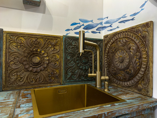 Интерьер «Голубая Лагуна»: Тиковая мебель ручной работы, антикварные арт-объекты, коллекционные предметы декора, тёплый свет и продуманная композиция каждой детали. Студия создавалась как личное пространство для отдыха и восстановления — уютная, тёплая, атмосферная.