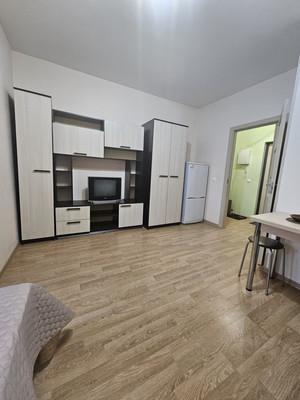 Сама квартира правильной квадратной формы , у окна выделена зона спальни, отдельно стоящий холодильник. Вся мебель и техника, включая холодильник и стиральную машинку, остается бонусом новому владельцу!