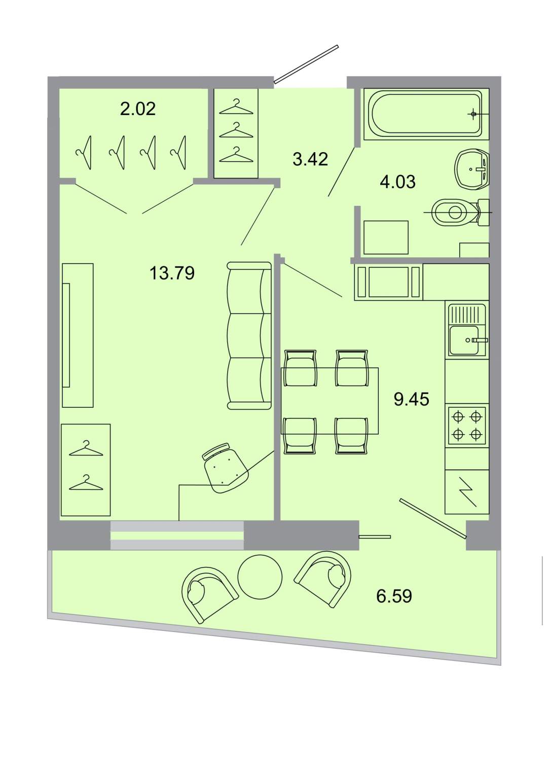 - Общая площадь 33.9 м²