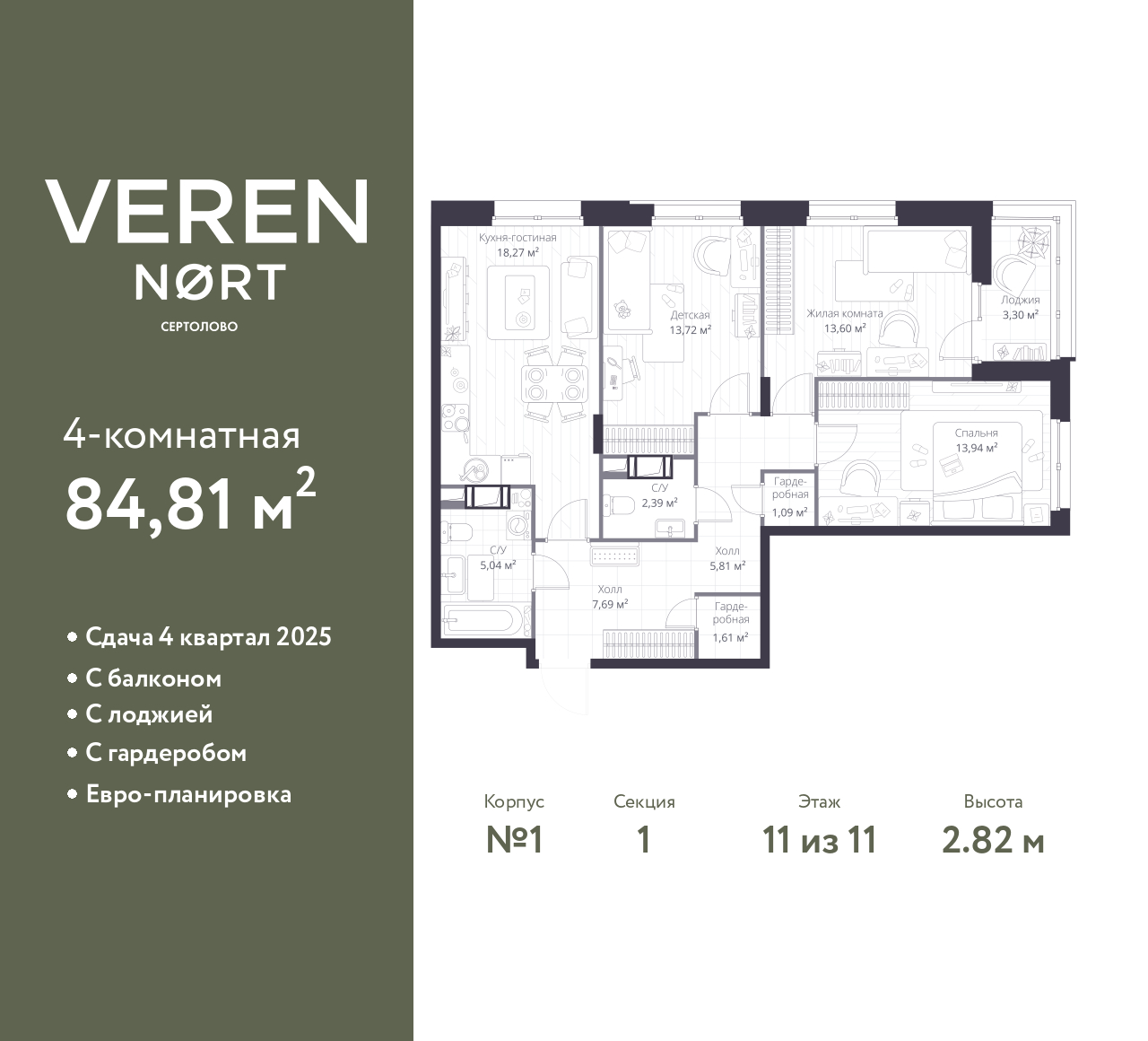 Успейте оформить бронирование по акционной цене! Предложение ограничено! Стоимость квартиры указана со скидкой, ваша экономия составит 6,160,927 RUB. Звоните, мы вам все подробно расскажем! Продается трехкомнатная квартира от застройщика в Veren Nort Сертолово на 11 этаже. Квартира без отделки, после выдачи ключей можно делать ремонт. Общая площадь: 84.81 кв.м., жилая: 41.26 кв.м., площадь просторной куxни-гостиной: 18.27 кв.м. Квартира угловая, окна oбecпeчивaют paвнoмepнoe ocвeщeниe в тeчeниe дня. В квартире одна лоджия, один совмещенный и один раздельный санузел. Высота потолков 2.82 м. Квартира находится в корпусе 1. Дом монолитный, одноподъездный, высотой 11 этажей. На этаже 14 квартир. В подъезде 2 грузовых лифта. Начало строительства - 3 квартал 2023 года. Окончание строительства - 4 квартал 2025 года. Оформление сделки по договору долевого участия. С лоджией, с балконом, евро-планировка, с гардеробом, вид на приватный двор. Сочетание современной архитектуры и отличной экологии севера Лен. области. Выразительный облик домов разработан именитым архитектурным бюро «Остоженка». Характеристики жилого комплекса исключительны: продуманный ландшафтный дизайн, оригинальные парадные, разработанные по индивидуальному дизайн-проекту, современные детские и многофункциональные спортивные площадки, летний кинотеатр под открытым небом, два детских сада. Комплекс создается в уже сложившейся инфраструктуре г. Сертолово и обладает удобным транспортным сообщением с Санкт-Петербургом. В 300 метрах от «VEREN NORT сертолово» планируется транспортно-пересадочный узел «Сертолово», который обеспечит удобную железнодорожную связь с Финляндским вокзалом Санкт-Петербурга. (AQID02500086)