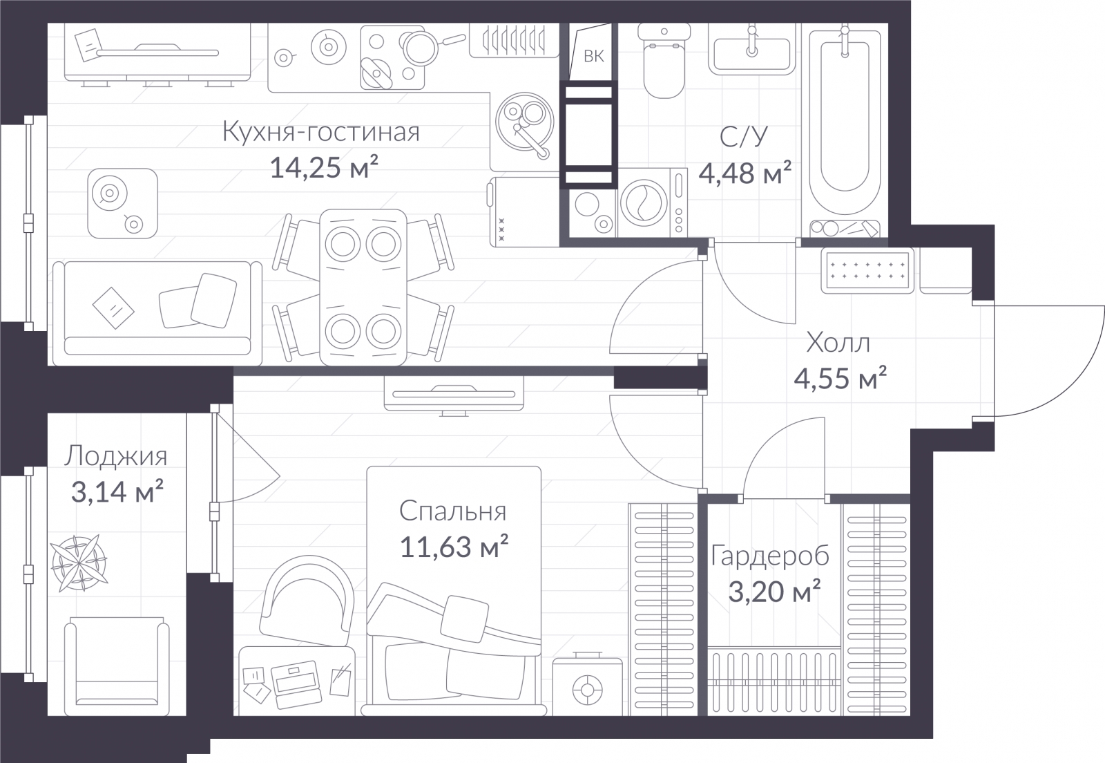 • Площадь кухни 14.25 м²