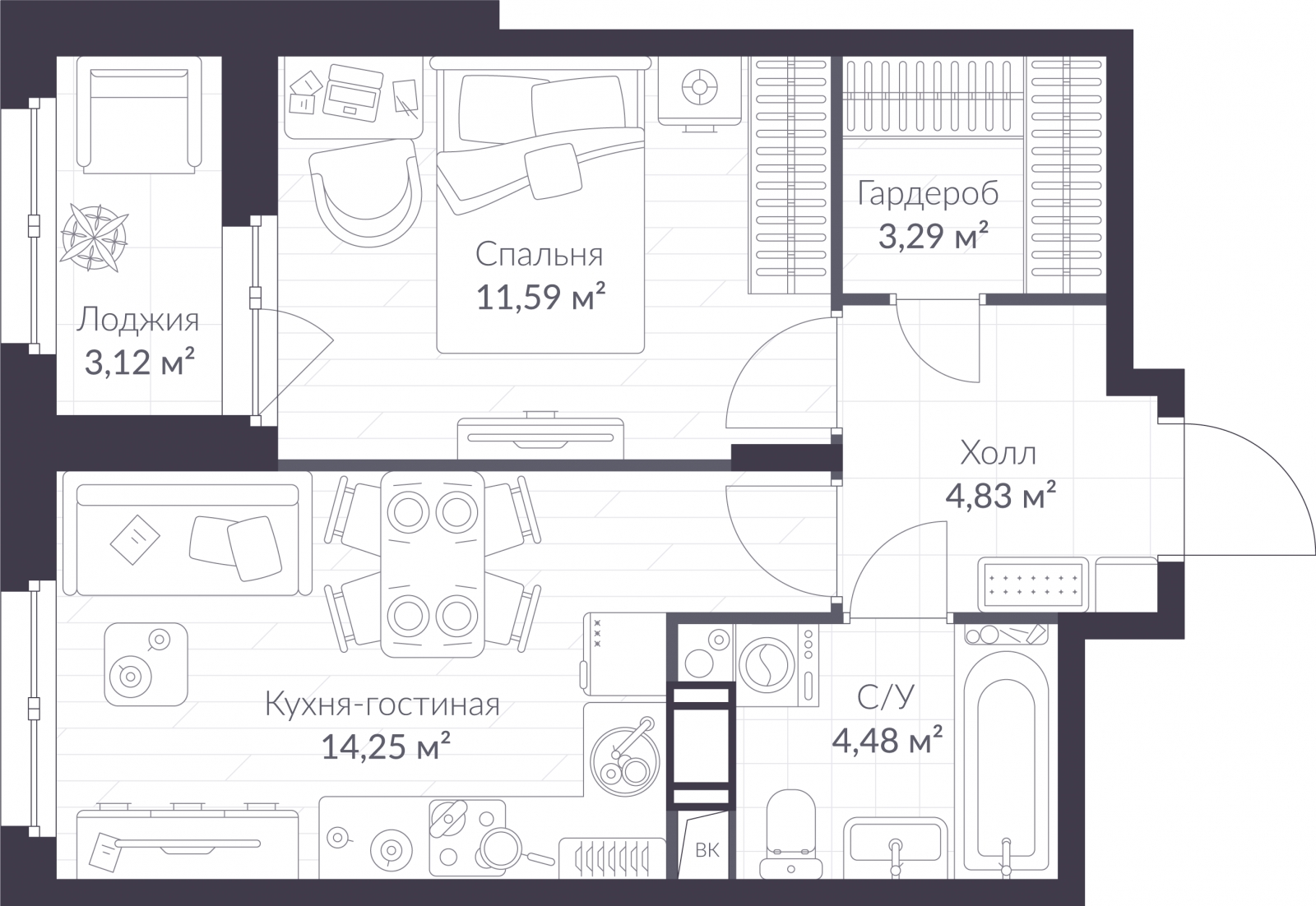 - Жилая площадь 11.59 м²