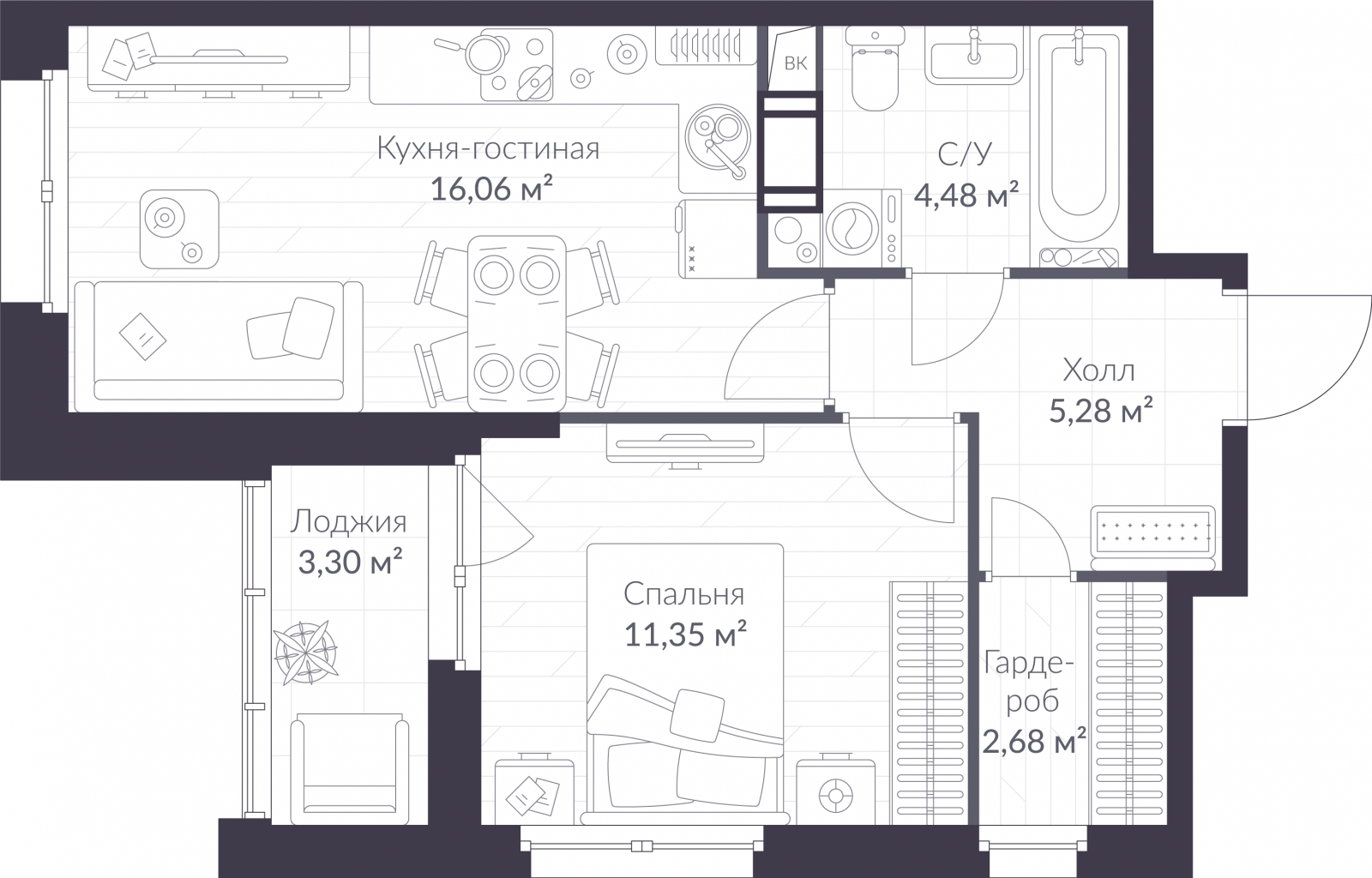 - Жилая площадь 11.35 м²