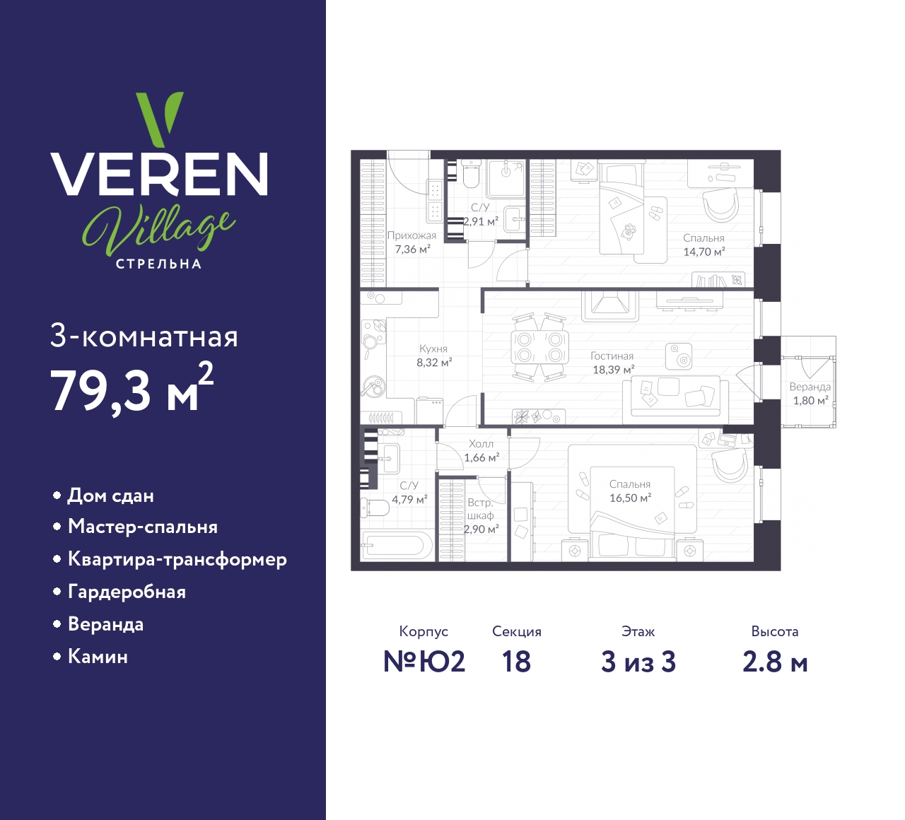 Спешите забронировать, пока действует скидка! Предложение ограничено! Стоимость квартиры указана со скидкой, ваша экономия составит 3,511,765 RUB. Информация по телефону, наши менеджеры вам все расскажут! Продается 2-комн. квартира от застройщика в ЖК "VEREN VILLAGE Стрельна" на 3 этаже. Квартира без отделки, полностью готова к ремонту. Общая площадь: 79.3 кв.м., жилая: 31.2 кв.м., площадь просторной куxни-гостиной: 26.71 кв.м. Комнаты изолированные, все окна выходят на одну сторону. В квартире один балкон, два совмещенных санузла. Высота потолков 2.8 м. Дом монолитный, двухподъездный, высотой 3 этажа. Квартира находится в 1-й секции в корпусе Южный 2. В подъезде 1 грузовой лифт. Строительство окончено, дом сдан во 2 квартале 2022 года. Оформление сделки по договору купли-продажи. Веранда, квартира-трансформер, камин, гардеробная, мастер-спальня. VEREN VILLAGE Стрельна - малоэтажный жилой комплекс бизнес-класса, расположенный в престижном Петродворцовом районе Санкт-Петербурга. Рядом с комплексом находится Константиновский дворец (всего 800 метров), до Финского залива - 1,5 км. Исторической окружение, чистый воздух уютного зеленого района, озеро с благоустроенной набережной на закрытой территории комплекса, собственный спортивно-оздоровительный комплекс с плавательным бассейном - все это делает жизнь в VEREN VILLAGE спокойной и уютной, максимально приближенной к загородной. А до КАД можно добраться за 5 минут. Все дома на территории - трехэтажные, во дворе каждого из них высажены деревья разных пород, в каждом дворе своя. Трёхэтажные дома VEREN VILLAGE стрельна не закрывают от вас солнце и звёзды. Вдоль главной дороги комплекса - светлая сосновая аллея. Центральная площадь выходит на озеро, вдоль которого оборудована прогулочная набережная с велосипедными дорожками. Для отдыха устроены рыбацкий мостик и деревянная палуба-пляж - личный курорт для жителей VEREN VILLAGE стрельна. На каждом этаже находится не более 6 квартир. Архитектурный облик комплекса, разработанный знаменитым бюро "Остоженка" заслуживает особого внимания. При отделке фасадов домов применяется долговечный и эффектный кирпич ручной формовки. Все стильные парадные исполнены по авторскому дизайн-проекту с использованием натуральных материалов. Несмотря на малоэтажность, в парадных предусмотрены лифты. Ландшафтный дизайн разделил все пространство комплекса на тихие прогулочные зоны и места для активного отдыха. Вся территория VEREN VILLAGE закрыта и охраняется. Для автомобилей жильцов предусмотрен подземный паркинг. Аккредитация в банках: АО «Райффайзенбанк», ПАО Банк «ВТБ», «Сбербанк России», ОАО «Альфа-Банк», ПАО «Газпромбанк» и других. (AQID02411859)