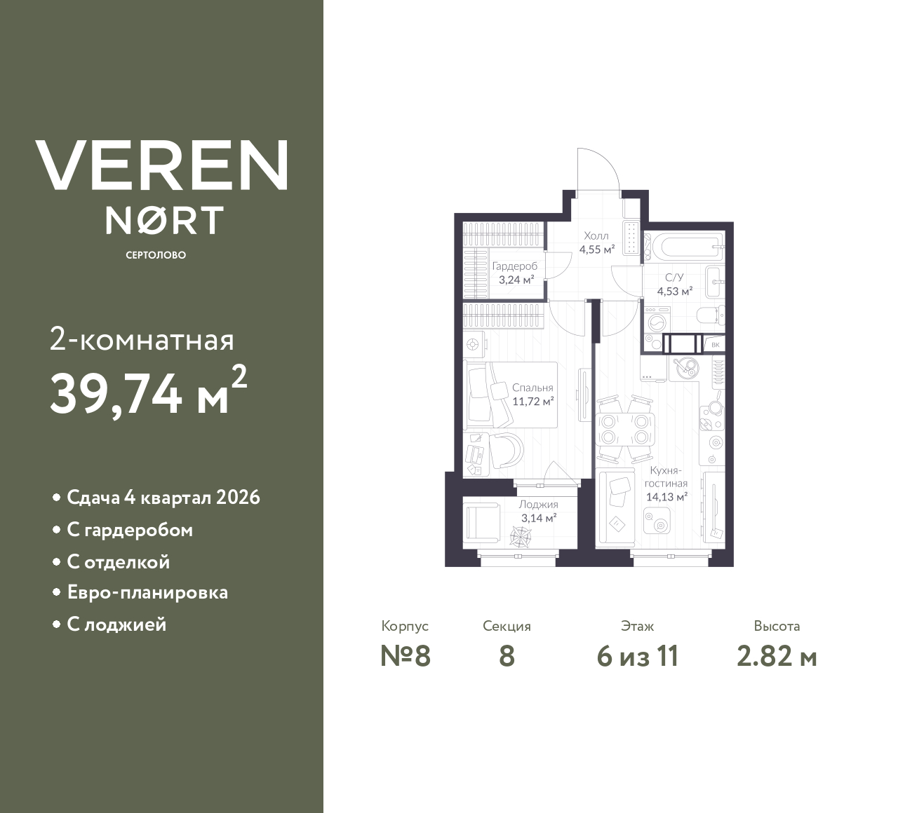 Успейте оформить бронирование, пока действует скидка! Предложение ограничено! Стоимость квартиры указана со скидкой, ваша экономия составит 829,252 RUB. Информация по телефону, мы вам все подробно расскажем! 1-комн. квартира в Veren Nort Сертолово на 6 этаже. Квартира без отделки, новый собственник может сделать ремонт по индивидуальному дизайн-проекту. Общая площадь: 39.74 кв.м., жилая: 11.72 кв.м., площадь просторной куxни-гостиной: 14.13 кв.м. Все окна выходят на одну сторону. В квартире одна лоджия, один совмещенный санузел. Высота потолков 2.82 м. Квартира находится в корпусе 8. Дом монолитный, одноподъездный, высотой 11 этажей. На этаже 14 квартир. В подъезде 1 пассажирский и 1 грузовой лифт. Окончание строительства - 4 квартал 2026 года. Оформление сделки по договору долевого участия. С лоджией, евро-планировка, с отделкой white box, с гардеробом, вид на приватный двор. Сочетание современной архитектуры и отличной экологии севера Лен. области. Выразительный облик домов разработан именитым архитектурным бюро «Остоженка». Характеристики жилого комплекса исключительны: продуманный ландшафтный дизайн, оригинальные парадные, разработанные по индивидуальному дизайн-проекту, современные детские и многофункциональные спортивные площадки, летний кинотеатр под открытым небом, два детских сада. Комплекс создается в уже сложившейся инфраструктуре г. Сертолово и обладает удобным транспортным сообщением с Санкт-Петербургом. В 300 метрах от «VEREN NORT сертолово» планируется транспортно-пересадочный узел «Сертолово», который обеспечит удобную железнодорожную связь с Финляндским вокзалом Санкт-Петербурга. (AQID02418152)