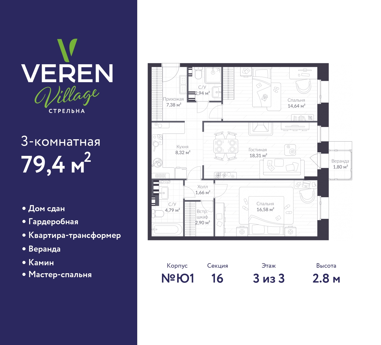 Торопитесь забронировать, пока действует скидка! Период предложения ограничен! Стоимость квартиры указана со скидкой, ваша экономия составит 3,529,412 RUB. По всем вопросам звоните в офис продаж, мы вам все подробно расскажем! Просторная 2-комн. квартира в ЖК "VEREN VILLAGE Стрельна" на 3 этаже. Квартира без отделки, полностью готова к чистовой отделке и дальнейшему ремонту. Общая площадь: 79.4 кв.м., жилая: 31.22 кв.м., площадь просторной куxни-гостиной: 26.63 кв.м. Комнаты изолированные, все окна выходят на одну сторону. В квартире один балкон, два совмещенных санузла. Высота потолков 2.8 м. Дом монолитный, двухподъездный, высотой 3 этажа. Квартира находится в 1-й секции в корпусе Южный 1. В подъезде 1 грузовой лифт. В настоящее время строительство завершено, дом сдан во 2 квартале 2022 года. Оформление сделки по договору купли-продажи. Веранда, квартира-трансформер, камин, гардеробная, мастер-спальня. VEREN VILLAGE Стрельна - малоэтажный жилой комплекс бизнес-класса, расположенный в престижном Петродворцовом районе Санкт-Петербурга. Рядом с комплексом находится Константиновский дворец (всего 800 метров), до Финского залива - 1,5 км. Исторической окружение, чистый воздух уютного зеленого района, озеро с благоустроенной набережной на закрытой территории комплекса, собственный спортивно-оздоровительный комплекс с плавательным бассейном - все это делает жизнь в VEREN VILLAGE спокойной и уютной, максимально приближенной к загородной. А до КАД можно добраться за 5 минут. Все дома на территории - трехэтажные, во дворе каждого из них высажены деревья разных пород, в каждом дворе своя. Трёхэтажные дома VEREN VILLAGE стрельна не закрывают от вас солнце и звёзды. Вдоль главной дороги комплекса - светлая сосновая аллея. Центральная площадь выходит на озеро, вдоль которого оборудована прогулочная набережная с велосипедными дорожками. Для отдыха устроены рыбацкий мостик и деревянная палуба-пляж - личный курорт для жителей VEREN VILLAGE стрельна. На каждом этаже находится не более 6 квартир. Архитектурный облик комплекса, разработанный знаменитым бюро "Остоженка" заслуживает особого внимания. При отделке фасадов домов применяется долговечный и эффектный кирпич ручной формовки. Все стильные парадные исполнены по авторскому дизайн-проекту с использованием натуральных материалов. Несмотря на малоэтажность, в парадных предусмотрены лифты. Ландшафтный дизайн разделил все пространство комплекса на тихие прогулочные зоны и места для активного отдыха. Вся территория VEREN VILLAGE закрыта и охраняется. Для автомобилей жильцов предусмотрен подземный паркинг. Аккредитация в банках: ПАО «Газпромбанк», АО «Райффайзенбанк», «Сбербанк России», ПАО Банк «ВТБ», ОАО «Альфа-Банк» и других. (AQID02411860)