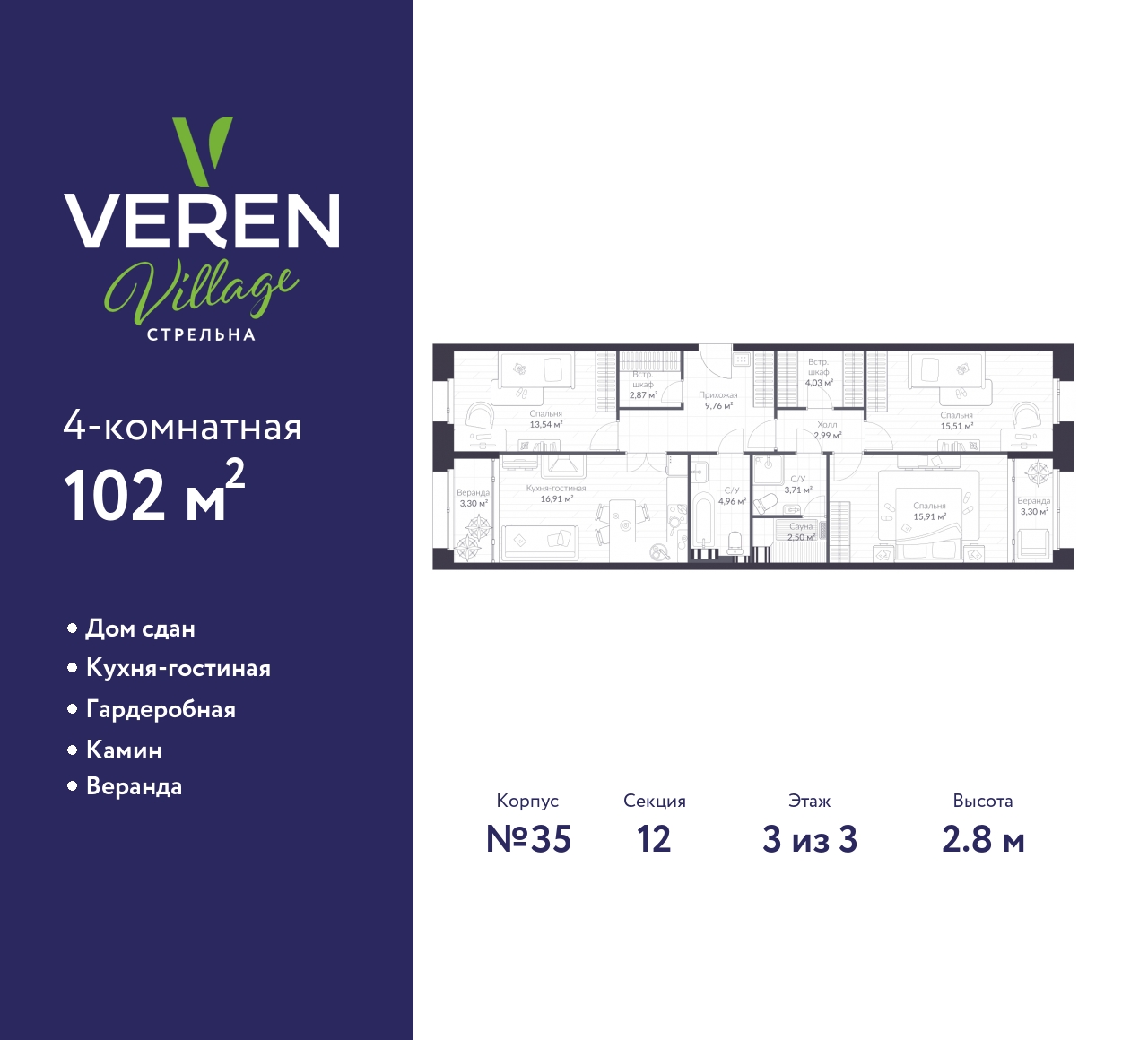 Торопитесь оформить бронирование по акционной цене! Предложение ограничено! Стоимость квартиры указана со скидкой, ваша экономия составит 4,147,059 RUB. Звоните, наши менеджеры вам все расскажут! Продается 3-комн. квартира от застройщика в ЖК "VEREN VILLAGE Стрельна" на 3 этаже. Квартира без отделки, полностью готова к ремонту. Общая площадь: 102 кв.м., жилая: 44.96 кв.м., площадь просторной куxни-гостиной: 16.91 кв.м. Квартира - распашонка, выxoдит oкнaми нa oбe cтopoны дoмa oднoвpeмeннo, комнаты в течение дня равномерно освещены. В квартире две лоджии, два совмещенных санузла. Высота потолков 2.8 м. Дом монолитный, черырехподъездный, высотой 3 этажа. Квартира находится в 1-й секции в корпусе Западный 5. В подъезде 1 грузовой лифт. Строительство окончено, дом сдан во 2 квартале 2022 года. Оформление сделки по договору купли-продажи. Веранда, куxня-гостиная, камин, гардеробная. VEREN VILLAGE Стрельна - малоэтажный жилой комплекс бизнес-класса, расположенный в престижном Петродворцовом районе Санкт-Петербурга. Рядом с комплексом находится Константиновский дворец (всего 800 метров), до Финского залива - 1,5 км. Исторической окружение, чистый воздух уютного зеленого района, озеро с благоустроенной набережной на закрытой территории комплекса, собственный спортивно-оздоровительный комплекс с плавательным бассейном - все это делает жизнь в VEREN VILLAGE спокойной и уютной, максимально приближенной к загородной. А до КАД можно добраться за 5 минут. Все дома на территории - трехэтажные, во дворе каждого из них высажены деревья разных пород, в каждом дворе своя. Трёхэтажные дома VEREN VILLAGE стрельна не закрывают от вас солнце и звёзды. Вдоль главной дороги комплекса - светлая сосновая аллея. Центральная площадь выходит на озеро, вдоль которого оборудована прогулочная набережная с велосипедными дорожками. Для отдыха устроены рыбацкий мостик и деревянная палуба-пляж - личный курорт для жителей VEREN VILLAGE стрельна. На каждом этаже находится не более 6 квартир. Архитектурный облик комплекса, разработанный знаменитым бюро "Остоженка" заслуживает особого внимания. При отделке фасадов домов применяется долговечный и эффектный кирпич ручной формовки. Все стильные парадные исполнены по авторскому дизайн-проекту с использованием натуральных материалов. Несмотря на малоэтажность, в парадных предусмотрены лифты. Ландшафтный дизайн разделил все пространство комплекса на тихие прогулочные зоны и места для активного отдыха. Вся территория VEREN VILLAGE закрыта и охраняется. Для автомобилей жильцов предусмотрен подземный паркинг. Аккредитация в банках: ОАО «Альфа-Банк», ПАО «Газпромбанк», АО «Райффайзенбанк», «Сбербанк России», ПАО Банк «ВТБ» и других. (AQID02411867)