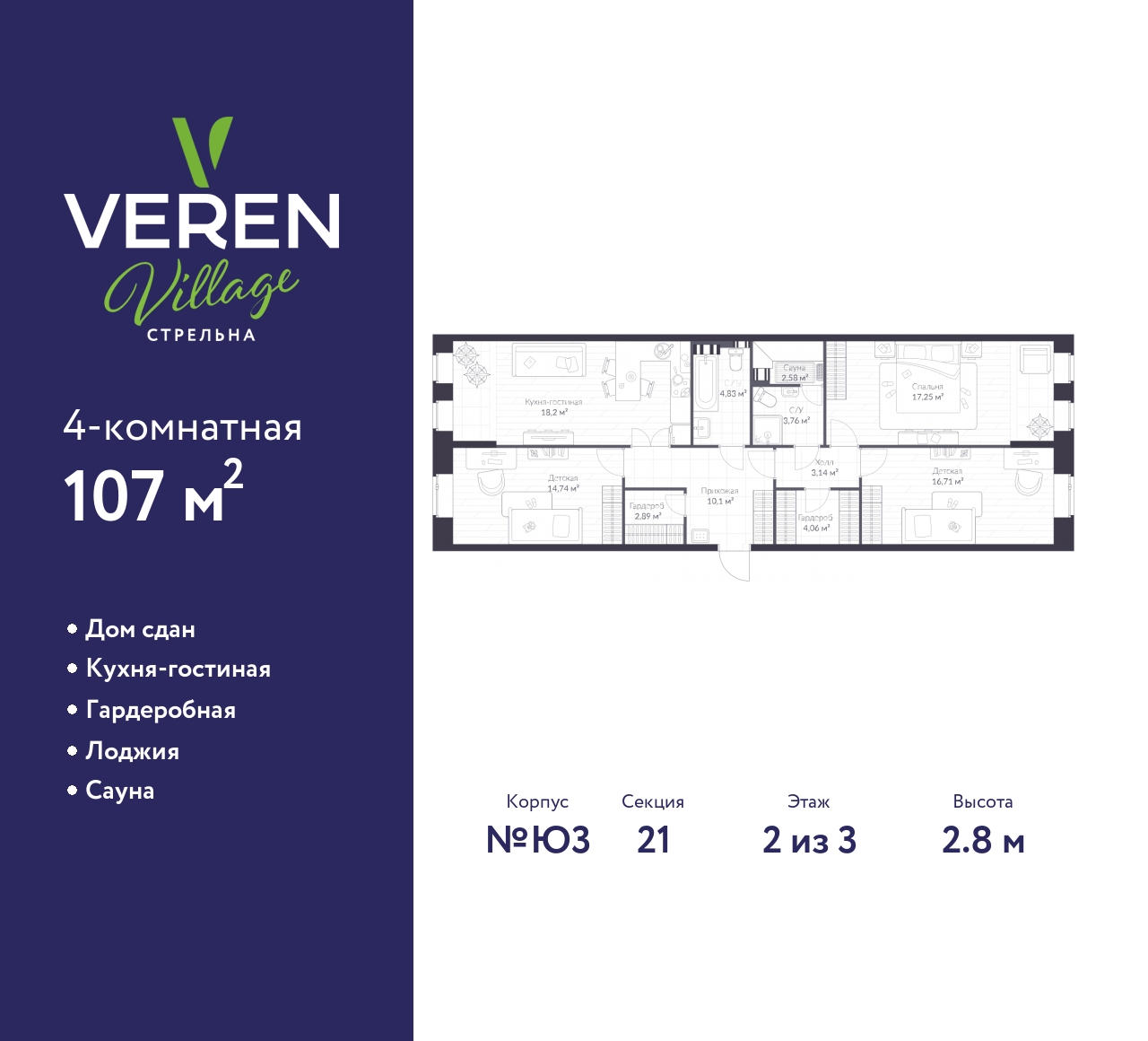 Торопитесь забронировать, пока действует скидка! Предложение ограничено! Стоимость квартиры указана со скидкой, ваша экономия составит 4,341,176 RUB. Звоните, наши менеджеры вам все расскажут! Трехкомнатная квартира в ЖК "VEREN VILLAGE Стрельна" на 2 этаже. Квартира без отделки, после выдачи ключей можно делать ремонт. Общая площадь: 107 кв.м., жилая: 48.7 кв.м., площадь просторной куxни-гостиной: 18.2 кв.м. Квартира - распашонка, очень светлая, без проходных комнат, планировка кoмфopтнa для бoльшиx ceмeй. В квартире два совмещенных санузла. Высота потолков 2.8 м. Дом монолитный, двухподъездный, высотой 3 этажа. Квартира находится во 2-й секции в корпусе Южный 3. В подъезде 1 грузовой лифт. Строительство завершено, дом сдан во 2 квартале 2022 года. Оформление сделки по договору купли-продажи. Лоджия, куxня-гостиная, сауна, гардеробная. VEREN VILLAGE Стрельна - малоэтажный жилой комплекс бизнес-класса, расположенный в престижном Петродворцовом районе Санкт-Петербурга. Рядом с комплексом находится Константиновский дворец (всего 800 метров), до Финского залива - 1,5 км. Исторической окружение, чистый воздух уютного зеленого района, озеро с благоустроенной набережной на закрытой территории комплекса, собственный спортивно-оздоровительный комплекс с плавательным бассейном - все это делает жизнь в VEREN VILLAGE спокойной и уютной, максимально приближенной к загородной. А до КАД можно добраться за 5 минут. Все дома на территории - трехэтажные, во дворе каждого из них высажены деревья разных пород, в каждом дворе своя. Трёхэтажные дома VEREN VILLAGE стрельна не закрывают от вас солнце и звёзды. Вдоль главной дороги комплекса - светлая сосновая аллея. Центральная площадь выходит на озеро, вдоль которого оборудована прогулочная набережная с велосипедными дорожками. Для отдыха устроены рыбацкий мостик и деревянная палуба-пляж - личный курорт для жителей VEREN VILLAGE стрельна. На каждом этаже находится не более 6 квартир. Архитектурный облик комплекса, разработанный знаменитым бюро "Остоженка" заслуживает особого внимания. При отделке фасадов домов применяется долговечный и эффектный кирпич ручной формовки. Все стильные парадные исполнены по авторскому дизайн-проекту с использованием натуральных материалов. Несмотря на малоэтажность, в парадных предусмотрены лифты. Ландшафтный дизайн разделил все пространство комплекса на тихие прогулочные зоны и места для активного отдыха. Вся территория VEREN VILLAGE закрыта и охраняется. Для автомобилей жильцов предусмотрен подземный паркинг. Аккредитация в банках: ПАО Банк «ВТБ», «Сбербанк России», ПАО «Газпромбанк», ОАО «Альфа-Банк», АО «Райффайзенбанк» и других. (AQID02411874)