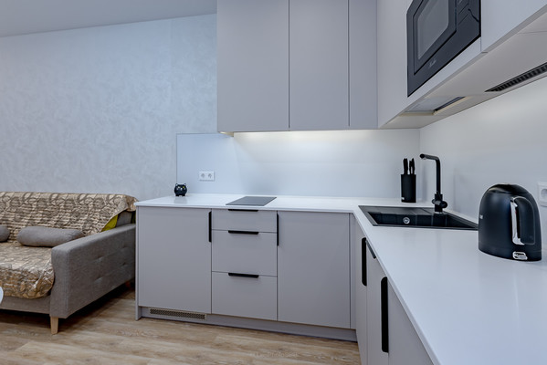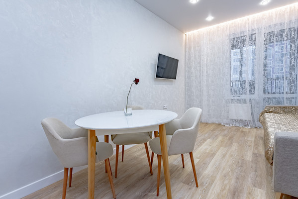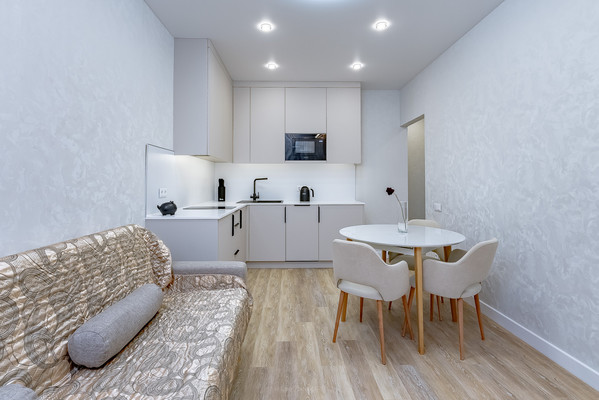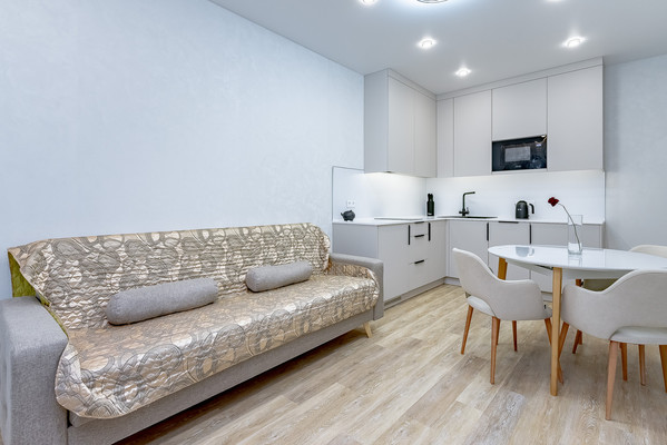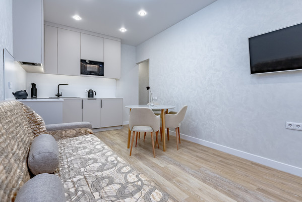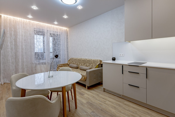 Просторная кухня-гостиная площадью 16,4 кв. м оборудована современной техникой и стильной мебелью, потолок натяжной, на полу кварцвиниловый ламинат. В квартире есть совмещенный санузел с качественной сантехникой. Тёплый пол в коридоре и санузле. Балкон также станет приятным дополнением для отдыха и хранения.