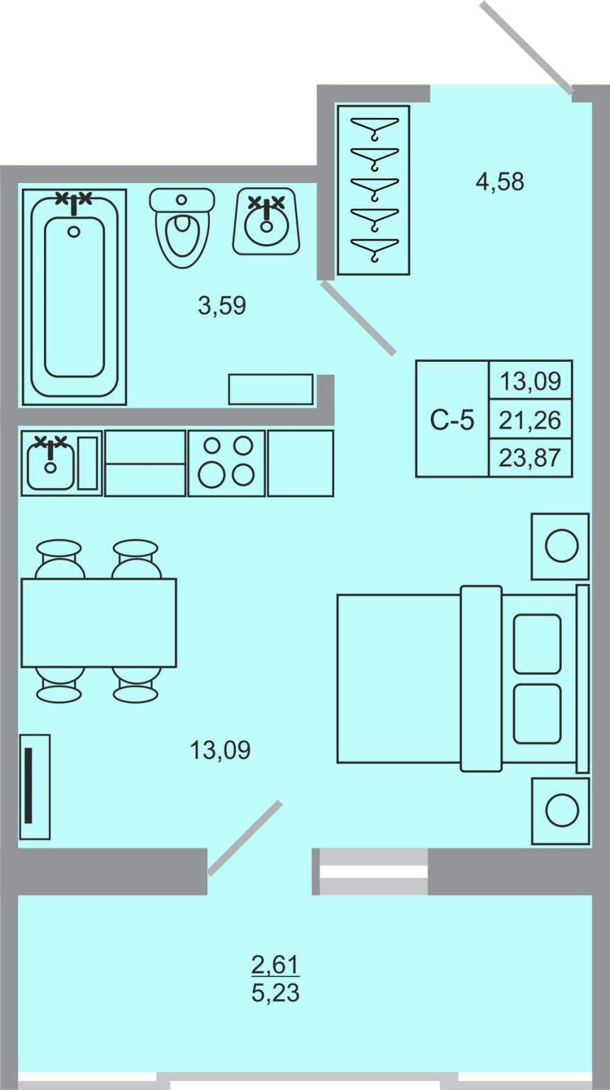 - Общая площадь 23.6 м²