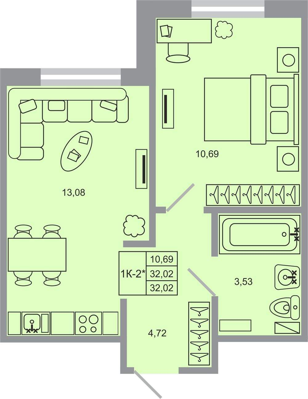 - Общая площадь 32.02 м²