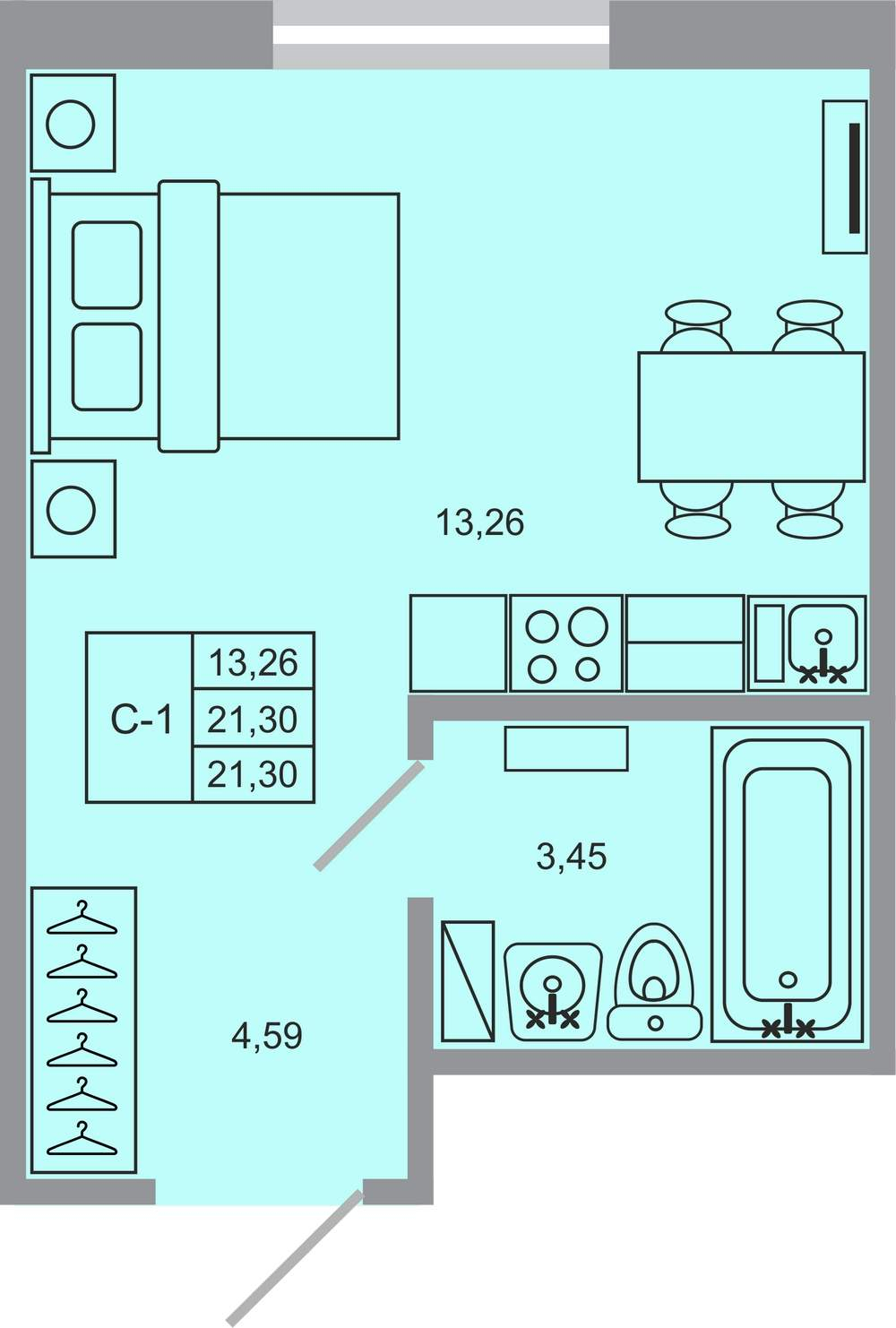- Общая площадь 21.3 м²