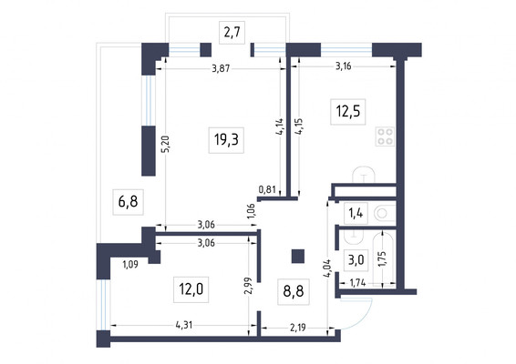 Общая площадь 57 кв.м. (без учета двух балконов)