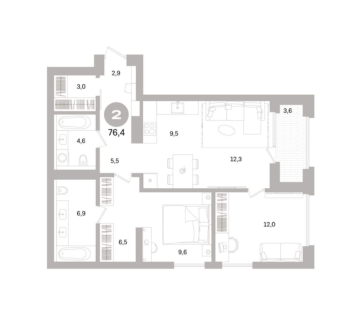 - Общая площадь 76.44 м²