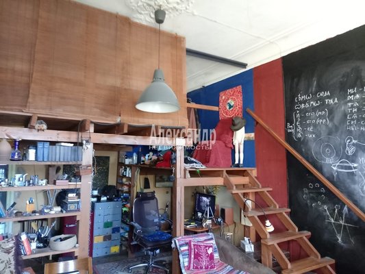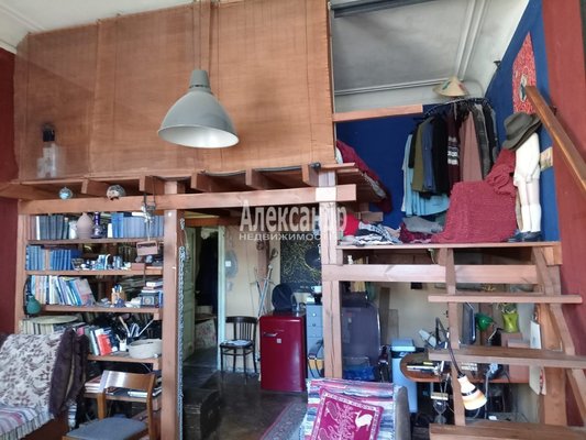 За счет очень высоких потолков 3,5 м в комнате оборудован двухсекционный второй уровень.