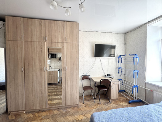 В комнате наполнение: кухнонный гарнитур, шкаф, кровать, комод, телевизор, стол, стул, стиральная машинка, холодильник. Имеется своё место на кухне. Раздельный санузел, в коридоре есть место под верхнюю одежду, что очень удобно.