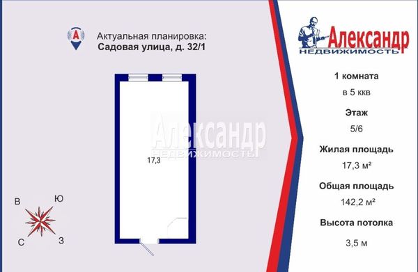 - Жилая площадь 17.3 м²